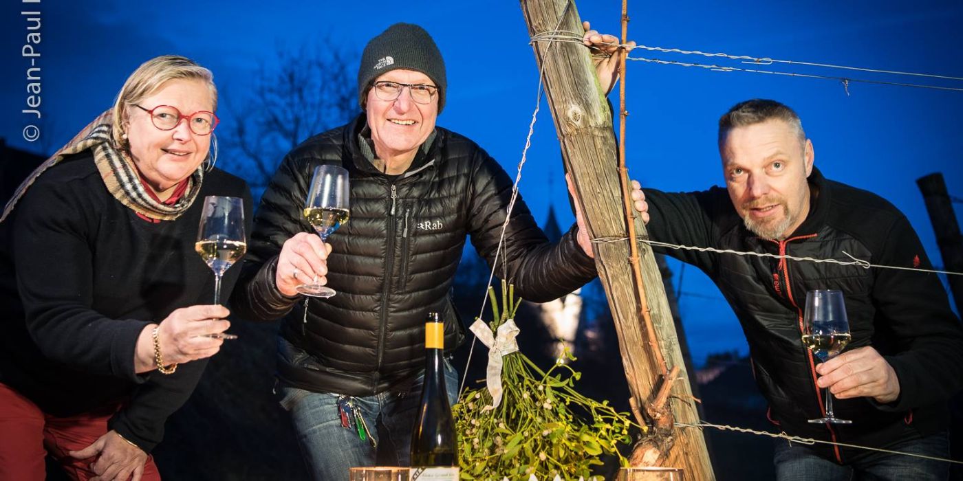 S’gilt ! Voici les trois artisans – Martine, Jean-Philippe et Jean-François Becker – de ce beau Grand Cru Froehn, Gewurztraminer 2014, dégusté dans les vignes, le soir de l’Epiphanie, en accompagnement de la galette des Rois.GC Frohn